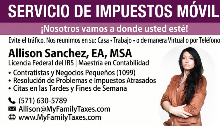Specialized tax strategies for 1099 contractors and Schedule C businesses. Maximize your deductions." Estrategias fiscales para contratistas 1099 y pequeños negocios. Maximice sus deducciones legalmente.